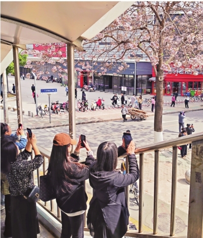 我忍不住也举着手机拍摄,镜头里的每一幅画面都美极了。温馨提示前来观赏的朋友们:拍摄时注意安全,不要站在道路中间影响交通,可到旁边的人行天桥上拍照;如果身着嫩绿色或白色服饰入镜,会有意想不到的“撞色”美感。