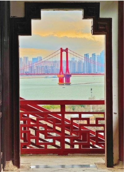 龟山公园蝴蝶泉边,游客们争相拍摄“古今同框”画面。城市书房的红色阁楼与鹦鹉洲长江大桥相互映衬,非常有意境。“这种传统与现代的碰撞太震撼了,武汉不愧是一座有历史、有活力的城市。”来自重庆的游客周先生边拍照边赞叹。
