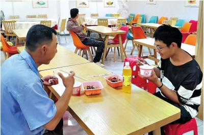 刚下班不久的荣宇恒和工友孙祥盛吃得很香。两人碗里夹了不少菜,有肉有青菜,边聊天边吃饭。孙祥盛说:“今天的菜可以,我选了牛肉、粉条、白菜。”荣宇恒一边吃一边点头:“能吃饱,味道也很好。”