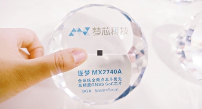 “这是我们自主研发的新一代AI融合定位芯片,相比同类产品尺寸降低50%,功耗降低40%,而信号捕获速度提升20倍。”梦芯科技董事长韩绍伟手持样品介绍说,这款逐梦系列芯片在强电磁干扰下仍保持厘米级定位,可广泛应用在无人机、智能驾驶等领域。