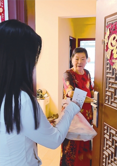 11时不到,送餐车驶出酒店,开往周边社区。网格员将午餐陆续送到订餐老人手中。