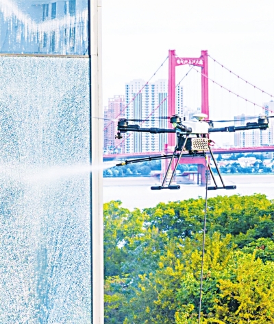 “起飞之前,无人机通过数字孪生技术在‘脑海’中构建了实体建筑的模样,模拟出最佳清洗路径。清洗过程中,无人机会实时监测并调整飞行姿态,无论建筑是平面、曲面还是立面,它都可以轻松应对,清洗完成后还能为建筑生成‘健康档案’。”胡飙说,“相较于传统人工清洗,无人机清洗技术40分钟就能完成人工半天才能完成的任务。单机日作业量可达8000平方米,效率提升20倍。”