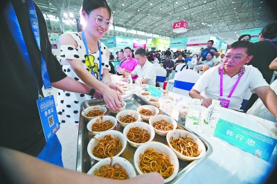 9月5日,在武汉国际博览中心举办的第二届武汉热干面节热干面大赛上,来自武汉各区的数十家热干面餐饮门店以及外地热干面品牌打起擂台,角逐最好吃的热干面。除了评委打分,还有现场大众评委参与。不同味道的热干面让每一个前来的市民都可以找到自己喜欢的口味。