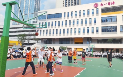 七年级(3)班的董尚贤和同学们进行着篮球3对3对抗训练,王嘉晨时不时跑到场边提醒他们注意技术要领。“我读小学时就喜欢打篮球,现在每天的体育课都有时间打篮球,这种感觉很好。”董尚贤说,他的折返跑比以前快了2秒,投篮命中率从30%提高到55%,在3对3对抗训练中的主动传球和团队配合也越来越好。