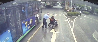 吕希见状,向车内乘客简短说明情况后开门下车,飞奔到老人身旁,快速平稳地将老人推到路边安全地带,确认对方可以操控轮椅、无需其他帮助之后,这才匆匆返回公交车上,继续起步运营。