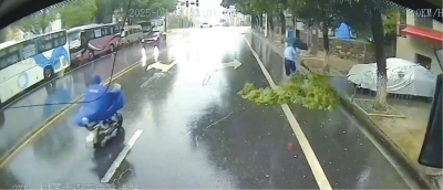 9月14日上午,在武汉树藩大街变电站附近的一处机动车道上,一幕意外状况影响了交通的正常秩序,因下雨树枝折断横在路面,对道路交通安全构成了威胁。