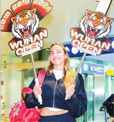 10月2日11时左右,WTA世界排名第一、武网“三冠王”的白俄罗斯选手萨巴伦卡抵达武汉,开心接过自己的“虎妞”专属欢迎标志牌。