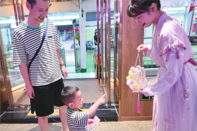 “李白”号游船上,节日氛围感拉满。当晚,游船工作人员身着汉服、手持蒲扇,为游客提供引导和讲解服务。他们还主动邀请游客合影,化身“月宫使者”为小朋友讲述中秋传说故事,用传统文化赋能高质量游船服务。现场更有工作人员随机为游客发放中秋定制款小花灯等精美礼品,游客们沉浸在一片欢声笑语中。此刻,民俗文化与时尚体验实现同频共振。