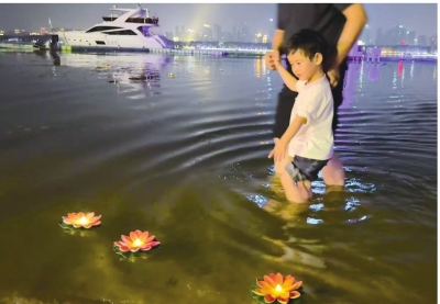 东湖沙滩上,“夹月饼挑战”进行得火热,小朋友们争相用超长道具筷子夹着月饼玩偶。家长李女士边拍照边笑着说:“孩子说要赢个‘月亮’回家,这比直接买月饼有意思多了。”日落时分,“落日声波”音乐会准时开场,沙滩变身音乐会现场,游客们或坐或立,跟着旋律轻轻哼唱。夜幕降临后,水上漂浮影院巨幕亮起,游客们躺在浮床上,享受着独一份的观影体验。不远处,点点星光闪烁,游客将手中的花灯缓缓推入湖中,寄托心愿。盏盏花灯随波荡漾,与天上明月、水中光影构成一幅祥和的画卷。