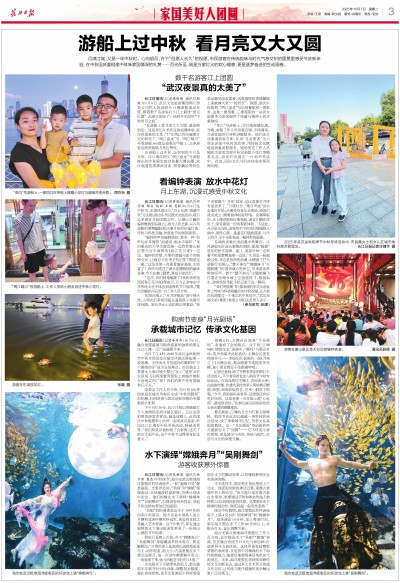 月满江城,又是一年中秋时。心向明月,许下“但愿人长久”的祝愿,市民游客在传统韵味与时代气息交织的图景里感受节庆新体验,在中秋国庆喜相逢中体味家国情深的礼赞……月光所至,既是万家灯火的欢心暖意,更是逐梦奋进的生动画卷。