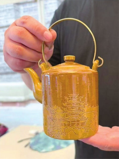 湖畔陶野马口窑工作室主理人刘双的摊位上,一只绘有黄鹤楼图案的茶壶吸引了不少游客。