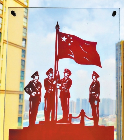 我从网上找了一张升国旗的照片,把每一处细节在心里先“剪”一遍:想剪出国旗飘扬时的飘逸感,心里要有风在吹拂的想象,手法得跟着那份灵动“走”;想呈现节日的热闹,线条里就得藏着欢喜。我先用铅笔细细临摹,再握着剪刀,手法又轻又柔,一点一点地沿着轮廓剪。整整两天,我静坐在桌前,沉浸在每一个弧度、每一处细节中,终于完成剪纸作品《升国旗》。
