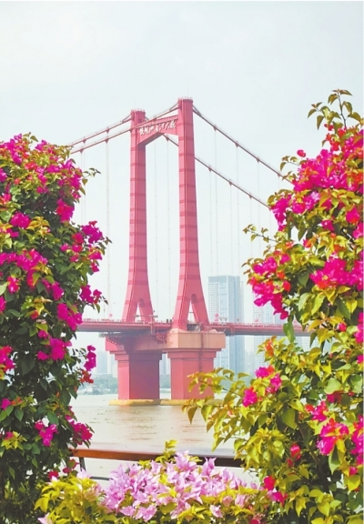 鹦鹉洲长江大桥如红色巨龙横卧江上,桥下的江水静静流淌。各色鲜花竞相绽放,大桥在花儿的簇拥下,更显生机与柔美。