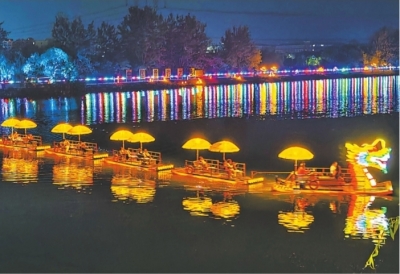 夜色如墨,灯火斑斓。湖面倒映着彩虹般的灯带,游船轻摇,伞影婆娑,仿佛驶入童话梦境。