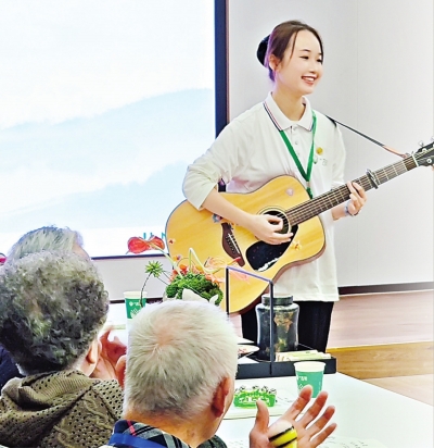 今年6月,22岁的欧莫正月从武汉音乐学院音乐教育学院音乐心理与治疗专业毕业,入职吉年颐养中心,进入照护部工作,成为长者们身边的“音乐伙伴”。