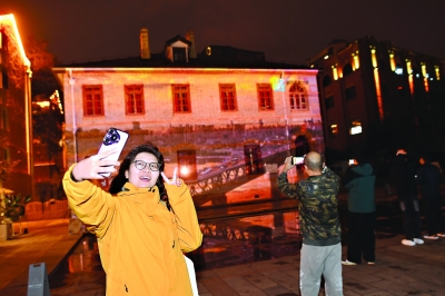 夜幕为纸,光影作笔。当四五十年前的武汉老照片“飞”上老房子,平和坊广场幻化成沉浸式光影空间,众多市民游客纷纷驻足,在光影中留影。