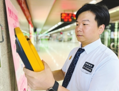 完成出入口巡查后,宋庆又来到站厅查看AED(自动体外除颤器)设备,“每天都要检查,以备紧急情况”。去年11月,一名乘客在地铁车厢内突然晕厥,宋庆在车站接应后,迅速判断患者状况。他通过拍打肩部、大声呼唤、触摸颈动脉、贴近胸部听心跳等方式,确认患者失去意识、停止呼吸和心跳。他立即实施急救,经过两轮胸外按压和人工呼吸后,使用AED对患者进行电击除颤,患者恢复了呼吸和心跳。