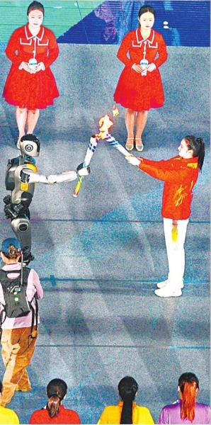 通过精准的动作控制与多模态交互系统,这位特殊的“火炬手”将燃烧的火炬安全、平稳地传递到等候的中国女足运动员王霜手中。