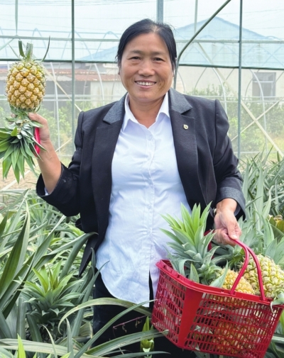 这抹金色的希望来之不易。8年前从湛江引进种苗后,刘翠娥经历了3年不开花的技术瓶颈。她没有认输,通过不断摸索,最终攻克了水土适应与精准催花等核心技术,将挂果周期成功从3年缩短至一年半。如今,这些亩产高达8000斤的凤梨,地头采摘价达每斤25元,成为农场发展的“黄金产业”。