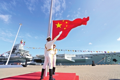 十一月五日,我国第一艘电磁弹射型航空母舰福建舰入列授旗仪式在海南三亚某军港举行。