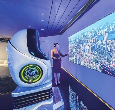 记者乘上高速电梯,抵达大楼顶层的“城市会客厅”,裸眼3D产品展示区、全息图像柱状屏、360度光影厅、虚拟现实参观区……科技感扑面而来。这里将成为入驻企业共享使用的区域。