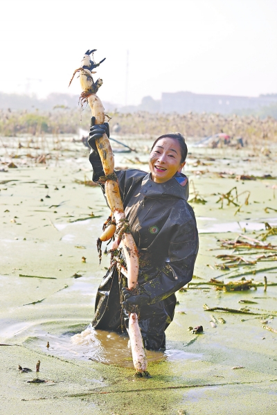 已经挖了三年藕的胡琴已十分熟练,高压水枪卡在腋下,另一只手在水里,顺着莲藕的形状慢慢摸着挖,挖一段冲一段,一根完整的藕就被挖了出来。