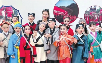 楚剧演员何菲(后排左三)与小演员们合影。
