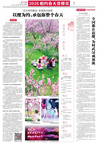 全市公园推出30余场主题赏樱活动,如黄鹤楼“樱约黄鹤”、武汉动物园“樱语伴鸣”研学、乘空轨穿梭“樱花云海”等,让赏花体验别具一格。