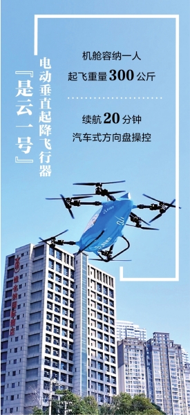 在汉阳造低空生态中心,记者见到了这款名为“是云一号”的电动垂直起降飞行器。这款蓝色飞行器机舱能容纳一人,启动后就会原地平缓升起。“这款飞行器起飞重量300公斤,续航20分钟,独创汽车式方向盘操控降低门槛。”是云航空董事长胡乐说,“只要会开车,就会驾驶这个飞行器。”