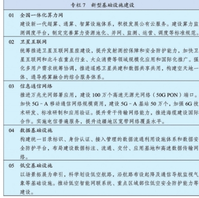 围绕支撑产业升级和数智化发展,推进新型基础设施布局建设和集约高效利用。完善信息通信网络,深化第五代移动通信(5G)、千兆光网规模部署,推进第五代移动通信演进(5G-A)、万兆光网建设发展和第六代移动通信(6G)技术创新,推动移动物联网自主迭代。深入推进东数西算工程,构建多层次算力设施体系和全国一体化算力网。实施国家区块链网络建设工程。完善民用空间基础设施,统筹建设卫星通信、导航、遥感系统,加快低轨卫星互联网组网。推进交通、能源、水利等基础设施数智化升级。(专栏7)