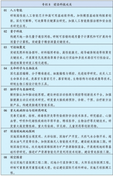 瞄准世界科技前沿强化系统布局,实施人工智能、量子科技、生物科技、新能源等科技战略部署,加快突破基础理论和底层技术,促进转化应用。高水平组织前沿技术预测预见,建立国家关键和新兴技术清单,持续推动前沿技术研发。强化科学研究、技术开发原始创新导向,优化有利于原创性颠覆性创新的环境,创新非共识项目遴选和资助机制,扩大国家重大科技任务、国家自然科学基金原创性颠覆性项目规模和比例。突出国家战略需求,扎实推进国家科技重大专项,超前部署面向2035的国家重大科技项目。(专栏8)