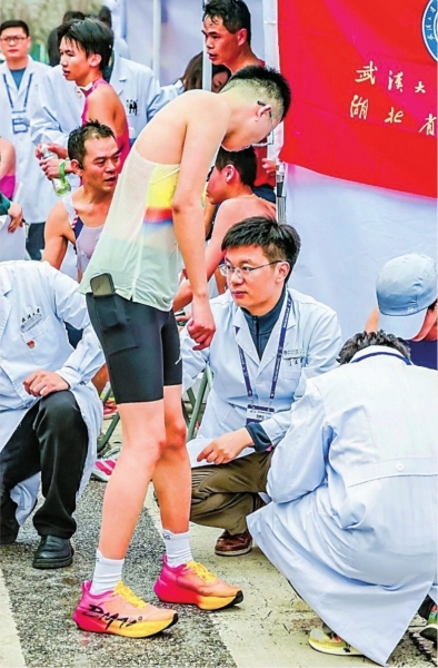在武汉SKP门口,来自湖北省康复医院的20多名医师为半马选手提供康复理疗服务,大批跑友有序排队。