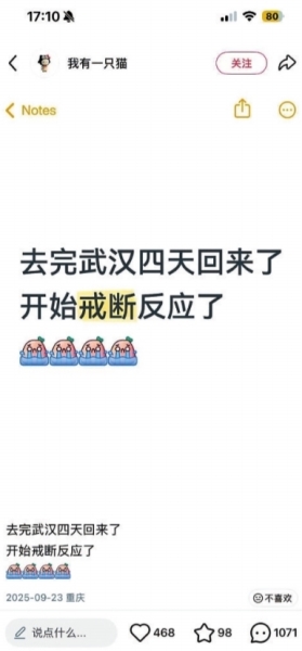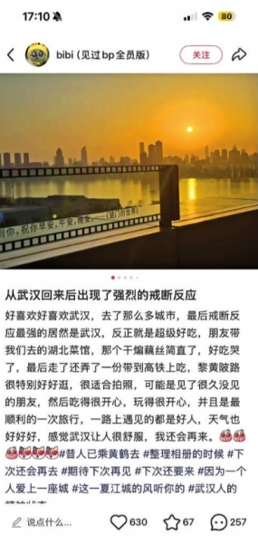 这种情绪并非孤例。在小红书、微博等平台,“武汉戒断反应”的相关分享数千条。有人用200张美食照片“解馋”,有人将江城美景设为手机壁纸日夜相对,更有人认真地研究起落户政策。