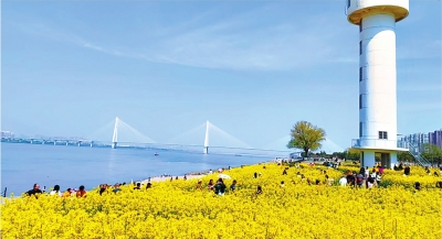 “来,沿着江滩赏花去!”湖北武汉,长江浩荡,蜿蜒的江滩上,粉色的玉兰花、灿黄的油菜花等连成浪漫花海,人们三五成群,相约赏花成为春日新风尚。蔚蓝的天空下,奔跑的孩子、身着汉服的少女,将江滩春景装点得更加生机勃勃。