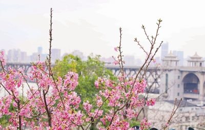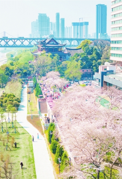 龟山樱花与长江大桥构成唯美画卷。