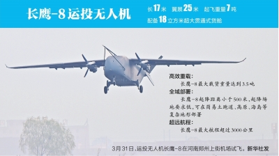 新华社郑州3月31日电(记者韩朝阳 杨静 郝源)3月31日9时35分许,郑州上街机场,长鹰-8大型运投无人机自主启动双发系统,沿跑道平稳加速、腾空而起。在约30分钟的飞行中,该机顺利完成智能飞控、航电、机电、动力燃油等各系统关键科目验证,随后稳稳返场刹停。我国首款7吨级固定翼运投无人机首飞成功。
