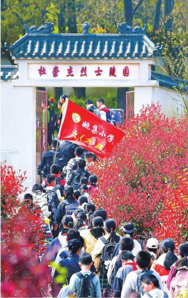 就在3天前,姚集小学110余名六年级学生徒步7公里,来到杜崇杰烈士陵园祭扫。孩子们列队、献花、敬礼,稚嫩的脸上满是崇敬。13岁的殷思琪带着一支鲜嫩的菊花,徒步7公里的路上一直小心翼翼地握在手里。她蹲下来把花放在碑座上,轻声说:“我把它放在这里,希望烈士能闻到花香。”