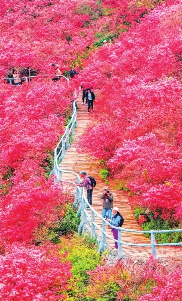 樱花季虽近尾声,但武汉的春天远未结束。紫藤、牡丹、泡桐、海棠、杜鹃、绣球……一茬接一茬的春花在江城景区、公园、街头巷尾接力绽放,织成一张“开不尽”的春日花毯。4月6日,央视新闻频道《朝闻天下》聚焦清明假期旅游市场,木兰云雾山万亩杜鹃花海火上央视。“今年清明假期,游客同比增长了20%。”木兰云雾山总经理王琏杰喜笑颜开地说道,“外地游客达到40%,还有不少北京、上海的游客也来了。”