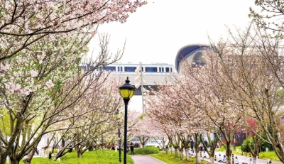 在1号线码头潭公园站A口下车,樱花成林,粉白花枝沿着步道层层叠叠,与远处弧形站房、穿梭列车相映成画,像藏在都市里的樱花隧道,可以拍到列车穿过樱花的绝佳照片。