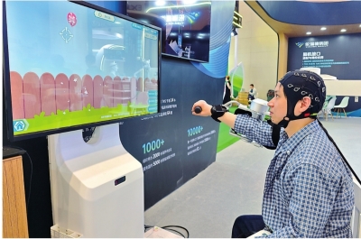 无需植入芯片,只需戴上光电帽就能用意念驱动外骨骼,完成上下肢训练。武汉依瑞德医疗设备新技术有限公司展示了国内首个“光电双模态”脑机接口康复系统,该系统已可实现“意念控制”下的上下肢康复训练及吞咽康复训练。“我们这套系统融合了超过100通道的近红外脑功能成像与脑电图信号,可同步采集与解码。”依瑞德产品经理刘天强介绍,当患者想象运动时,系统能解码其意图,并驱动外部康复设备辅助完成相应动作,从而重塑大脑与肢体之间的连接通路,为卒中、脊髓损伤等患者的主动康复提供强有力的工具。