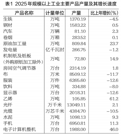 表1 2025年规模以上工业主要产品产量及其增长速度