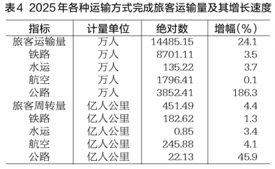 表4 2025年各种运输方式完成旅客运输量及其增长速度