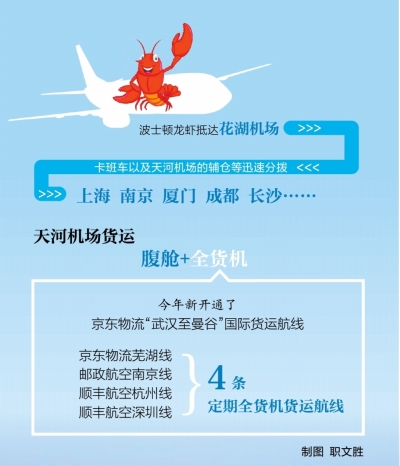 首航定于4月28日,每次约进口90吨波士顿龙虾,在鄂州分拨转运,货物抵达花湖机场,楚翔达公司将通过自己的卡班车以及天河机场的辅仓等迅速分拨至上海、南京、厦门、成都、长沙等国内主要消费城市。部分将存入武汉天河机场航空物流园新建的海鲜暂养池。该暂养池可一次性暂养10多吨海鲜,包括澳洲龙虾、俄罗斯帝王蟹等,保障节假日供应。