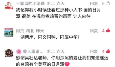 “‘一个日月潭在台湾,一个日月潭在大陆人心里。’新闻报道里的这句话太动人了。”在新疆大学读研究生的维吾尔族姑娘娜迪热·阿布力克木在本报微信公众号上跟评。她告诉长江日报记者,自己小时候不仅学过《日月潭》,还读过一篇关于武夷山和阿里山的传说,讲述勇敢少女花珊为民除妖,却导致大山分裂、母女隔海相望的凄美故事。“我记得里面写道,日月潭是孩子的眼泪,当时只觉得感动,现在读懂了背后的深意与深情。”