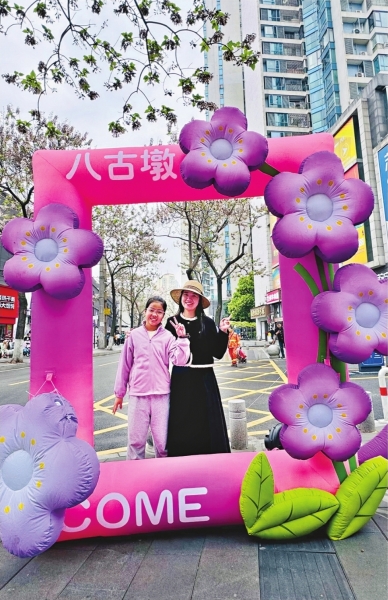 除了自然美景,街区还融入了“泡桐花”主题元素。从彩色墙绘到景观座椅,从氛围路灯到特色装饰,处处可见紫色点缀。位于路口的一家商超外墙被精心绘制上大幅泡桐花图案,引得不少居民争相合影。