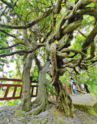 市园林科学研究院高级工程师史红文表示,这两株百年紫藤对攀附的朴树缠绕而不绞杀,彼此共生共荣,形成了植物界和谐共处的独特景象。