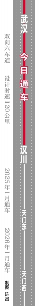 武天高速由武汉至汉川段、天门东段、天门西段组成,其中东段于2025年1月通车,西段于2026年1月通车。此次武汉至汉川段开通,实现了武天高速全线贯通。
