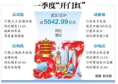 长江日报讯(记者陈永权)4月24日,武汉市统计局、国家统计局武汉调查队联合发布2026年一季度经济运行数据。初步核算,一季度全市地区生产总值(GDP)达5042.99亿元,按不变价格计算,同比增长5.7%,高于全国、全省平均水平,增速创近四年同期新高,经济运行保持平稳较快增长,实现良好开局。